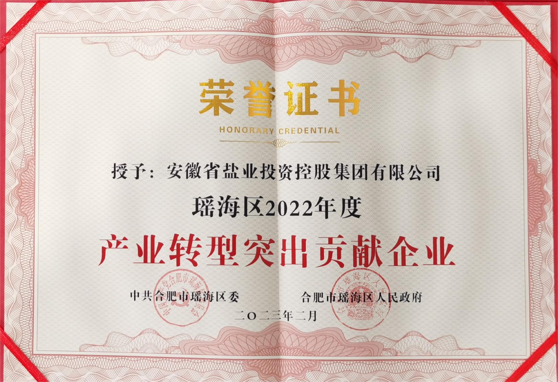 近日,省盐业世界杯网址大全获得瑶海区委、区政府授予的瑶海区2022年度“产业转型突出贡献企业”荣誉称号。