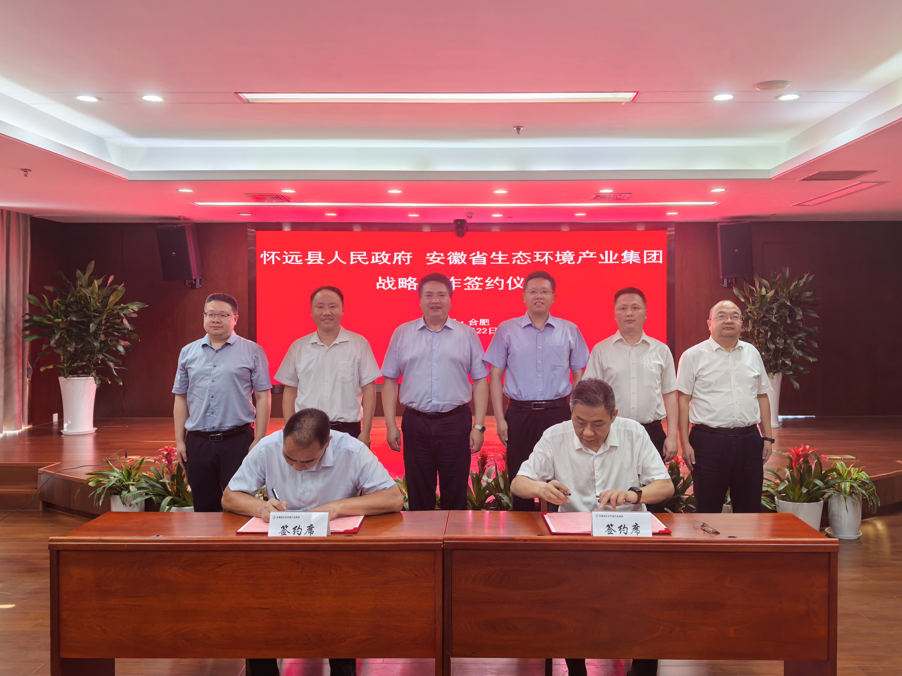 7月22日,省生态环境产业世界杯网址大全与怀远县签署战略合作协议。省生态环境产业世界杯网址大全党委书记、董事长罗太忠与蚌埠市委常委、怀远县委书记潘君齐出席签约仪式并见证签约。