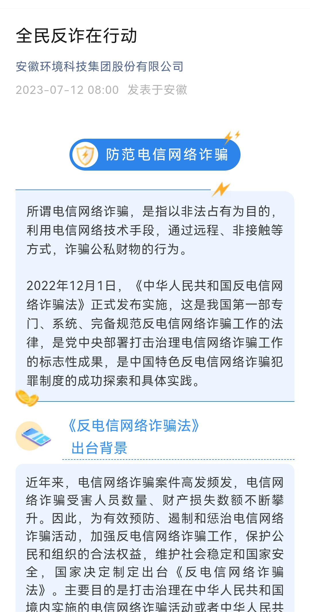 环境科技世界杯网址大全、省健康养老、徽盐金融等公司通过印制各类反诈宣传单、宣讲防范电信诈骗安全知识,在公众号发表普法文章等形式,号召全体员工增强防范意识。