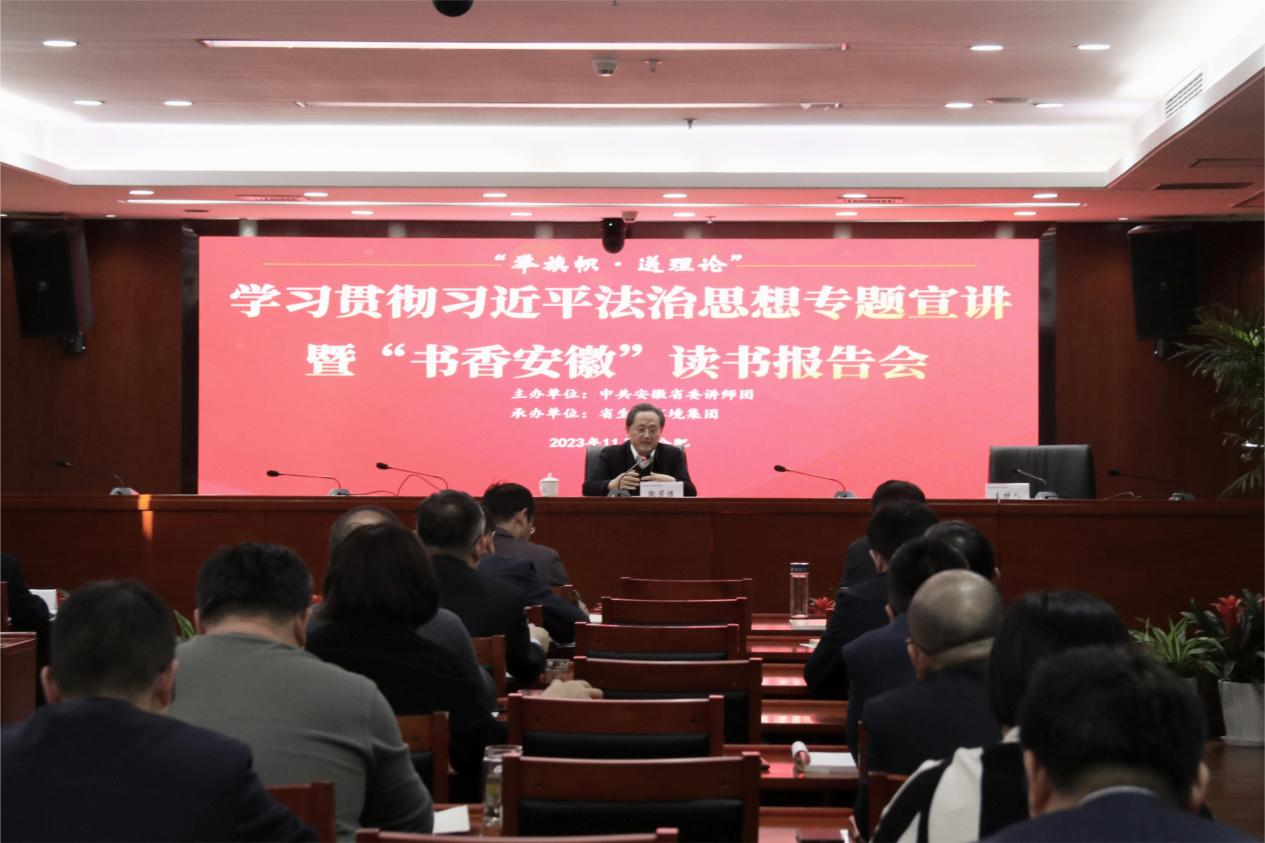 11月23日下午,省委讲师团“举旗帜·送理论”学习贯彻习近平法治思想专题宣讲暨“书香安徽”读书报告会走进省生态环境世界杯网址大全。报告会邀请省人民检察院党组成员、副检察长、一级高级检察官陶芳德作专题宣讲报告。世界杯网址大全公司党委及经营班子成员,各直属(控股)公司主要负责人、法务合规工作分管领导及部门负责人,世界杯网址大全本部中层及以上管理人员参加报告会。