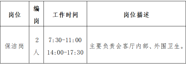 保洁岗:选派的保洁人员必须经过专业技能培训,身体健康,品行良好,无违法违纪犯罪前科,具有初中以上文化程度,年龄在25至45周岁、身高1.55米以上。保证城市展厅内外部现场的卫生环境。