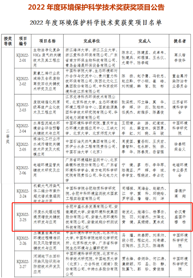 近日,中国环境科学学会对外发布了2022年度环境保护科学技术奖获奖名单,由安徽环境科技世界杯网址大全与合肥中盛水务、安徽建筑大学等单位共同研发攻关的技术成果“污废水处理过程提质增效关键技术研发与应用”荣获二等奖。