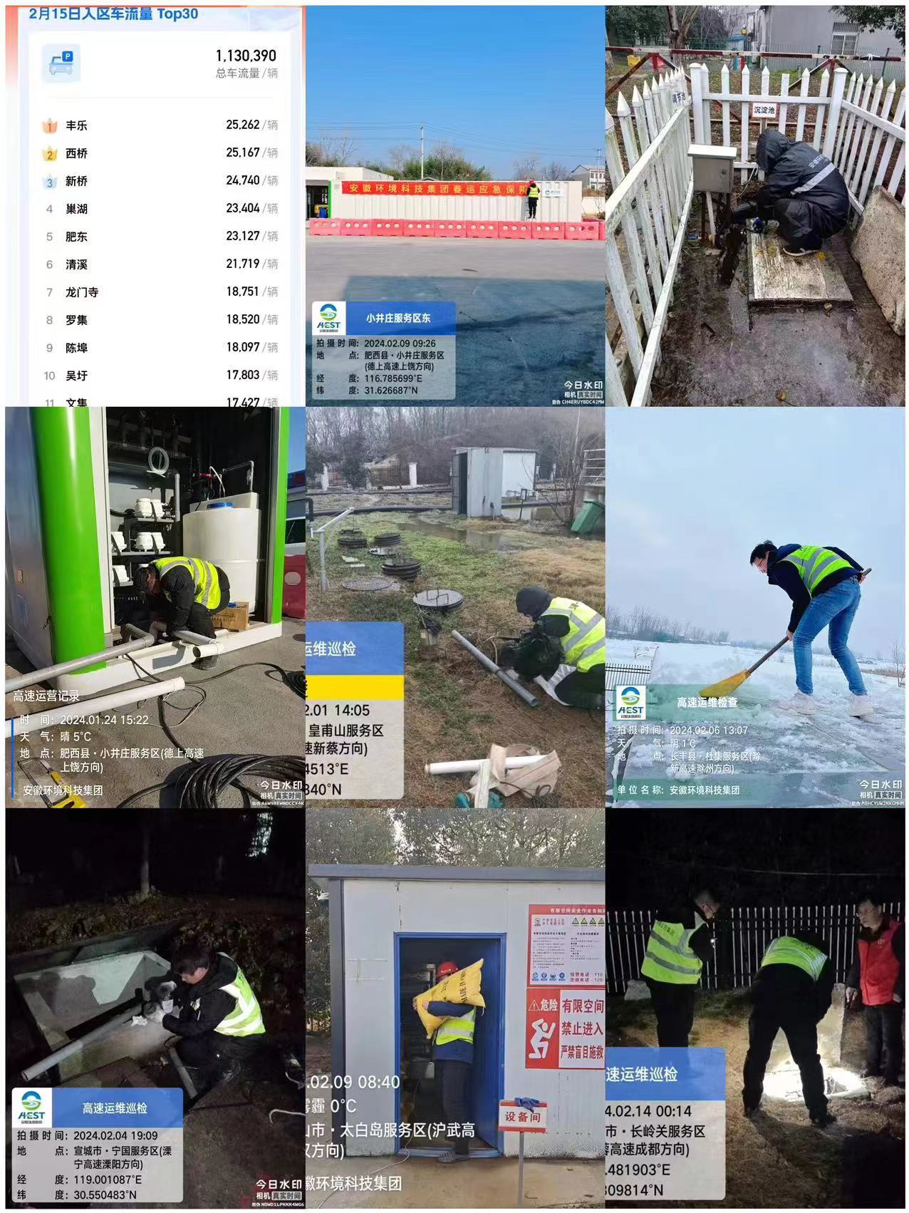 春运期间,安徽高速部分服务区超历史最大客流量,针对污水超量严重的服务区,环境科技世界杯网址大全公司统筹安排,将高速服务区污水外运至附近项目公司场站进行处置。除夕至年初一期间,环境科技世界杯网址大全公司利用高速客流短时回落的窗口期,紧急协调调试检修设备,确保返程高峰期运维服务质量。年初五夜间,由外单位负责运维的陈埠服务区突发泵站故障,接到协助请求后,环境科技世界杯网址大全公司不讲条件,连夜组织运维人员赶赴现场,迅速完成抢修,以实际行动践行国企担当。