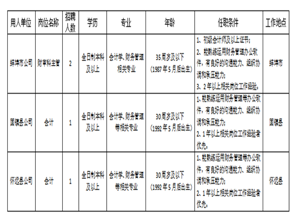 2、县公司会计:男女不限,全日制本科及以上学历,年龄30周岁及以下,会计学、财务管理等相关专业;1年以上相关岗位工作经验者优先。